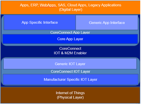 CoreConnect IOT Layer is an abstraction over the various technologies & connectivity platforms that are generally available in the industry. This layer has two sub-aspects, Generic IOT Layer & Mnfr specific IOT Layer